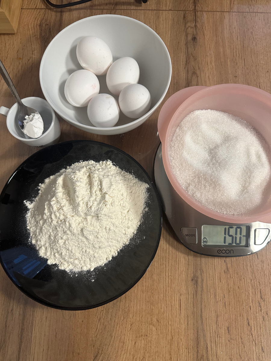 Очень легко и быстро! Понадобится форма диаметром 22-24см. Ингредиенты: 5 средних яиц (у меня категория С1) Щеп. соли, ваниль 150 г сахара 150 г муки 0,5 ч.л. разрыхлителя Включаем духовку на 180 градусов в режиме верх-низ. Берем яйца комнатной температуры, если не успели заранее вытащить их из холодильника, то можно подогреть в теплой воде. Разбиваем яйца в чашку, добавляем щепотку соли и начинаем взбивать миксером в течении 30 секунд добавляем ванилин (щепотку), либо ванильный сахар (1 ч.л), затем добавляем весь сахар и взбиваем миксером до увеличения объёма, чтобы масса была пышной и воздушной. Я взбиваю около 8-9 минут. Проверяем, если след от венчика не расползается хотя бы несколько секунд, то тесто готово, но все зависит от мощности миксера, у меня 800 ватт. Просеиваем муку, добавляем в нее разрыхлитель. Далее 1/3 часть муки добавляем в нашу сбитую массу. Если мука сразу не проваливается, значит тесто взбито правильно. Аккуратно венчиком или лопаткой перемешиваем муку сверху в