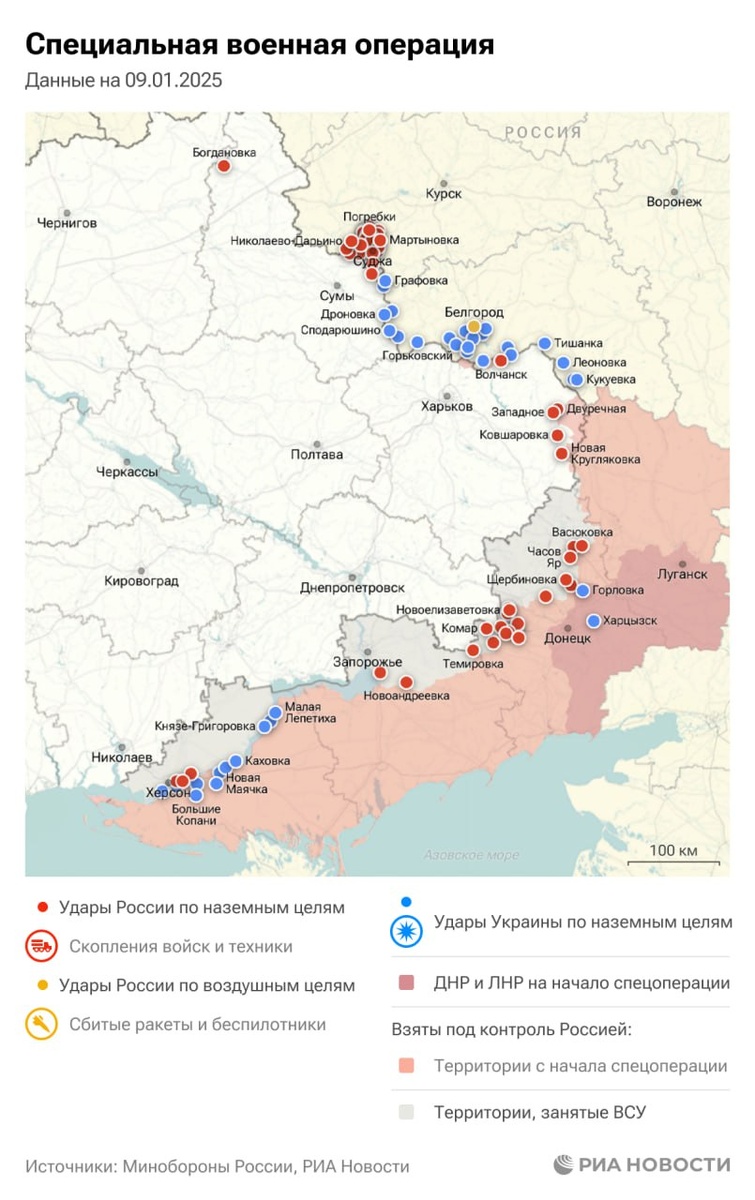 ▪️Потери украинских войск за сутки на разных направлениях составили до 1480 человек и два танка, следует из сводки Минобороны России; ▪️Средства противовоздушной обороны сбили управляемую авиабомбу Hammer производства Франции, 14 реактивных снарядов системы залпового огня HIMARS производства США и 71 беспилотник самолетного типа; ▪️Подразделения российской армии в курском приграничье уничтожили за сутки до 190 боевиков ВСУ, боевую машину пехоты, бронетранспортер, две боевые бронированные машины и другое вооружение ВСУ; ▪️Глава Пентагона Ллойд Остин на встрече контактной группы по Украине на авиабазе Рамштайн в Германии подтвердил выделение Украине пакета помощи в размере $500 млн; ▪️Контактная группа по поддержке Украины утвердила восемь дорожных карт по укреплению обороноспособности страны в воздухе, на земле и на море до 2027 года, следует из совместного заявления группы; ▪️Великобритания и союзники направят Украине 30 тысяч новых БПЛА в рамках международной коалиции по обеспече