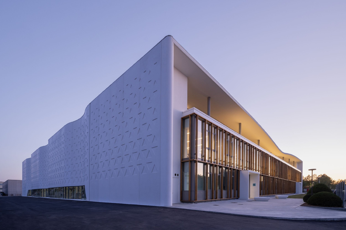 Исследовательский центр Tetra Pak в итальянской Модене от бюро ZPZ Partners. Издалека конструкция выглядит как большой пластиковый параллелепипед. Гладкие, с плавными изгибами по краям, практически глухие, молочно-белые, визуально мягкие и гибкие поверхности выполнены из сборных железобетонных панелей. Эти панели создают бесшовную и однородную оболочку. Треугольные формы, "отпечатанные" в бетонных панелях, постепенно уменьшаются в размерах кверху. Фасадная параметрика на минималках. TG канал - PRMTRC spc