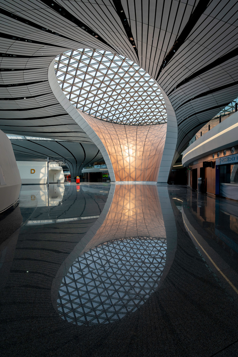 Международный аэропорт в столице Китая, пекинском районе Дасин. Открытие состоялось в 2019. Здание терминала было спроектировано Zaha Hadid Architects. Аэропорт стал новым хабом, точкой пересечения высокоскоростных и региональных железных дорог, метро и скоростных автомагистралей. + Пассажиропоток - 45 млн в год (к 2040 более 100 млн.) + Площадь этажей - 700 тыс. м2 + Площадь крыши - 180 тыс. м2 + Стоимость строительства - 450 млрд юаней (~ 63 млрд $) + 79 выходов с телескопическими трапами + Солнечные панели вырабатывают >10 МВт электроэнергии + Система сбора дождевой воды и естественная очистка до 2,8 млн м3 + Конструкция крыши содержит > 170 тыс. стальных элементов + На сооружение терминала израсходовано 52 тыс. тонн стали + Для строительства снесены 11 населенных пунктов, 24 перемещены из-за предполагаемой зашумленности (общее кол-во граждан - 20 тыс. чел.) Гибкая конструкция терминала сформирована благодаря восьми параболическим мегаколоннам, которые изгибаются от сводов потолка