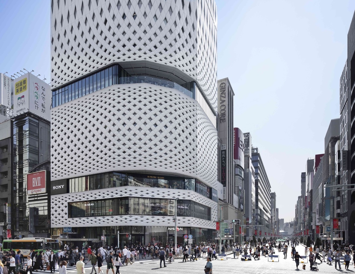 Ginza Place - новая достопримечательность, расположенная на одном из главных перекрестков Токио. Открытие состоялось в 2016. Авторы проекта - Klein Dytham Architecture Создание панельной системы такой сложности потребовало тесного сотрудничества между архитекторами Klein Dytham и ведущей японской строительной компанией Taisei Corporation. Лицевая сторона каждой панели выполнена из алюминия. В пластинах были сделаны надрезы, которые затем были сложены, сварены по швам и окрашены порошковой краской. Каждая панель была изготовлена заранее и ей был присвоен индивидуальный маркер ее положения на фасаде. Фасад вдохновлен сукасибори (особый тип открытой решетки, используемой в традиционных мелких ремеслах, таких как корзины и столовые приборы) По традиции - любимый гуглстрит. Безусловно, невероятно крутой параметрический фасад с 3д эффектом "уплывающей" полигональной сетки... Однако весь этот урбанистический визуальный "шум" прибирает ползунки вау-эффекта... ТЦ параметрического человека
