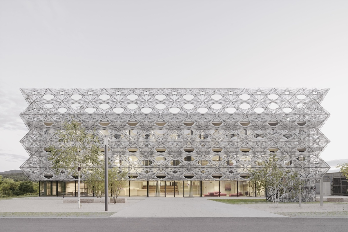 Новый инновационный образовательный центр Texoversum для текстильной ассоциации в Ройтлингене (Германия). Авторы проекта - бюро Menges Scheffler Architekten и Allmannwappner, совместно с инженерами Jan Knippers Ingenieure. Центр включает в себя учебные классы, мастерские, лаборатории, коллекцию исторических образцов текстиля и тканей, и прочие многофункциональные зоны. Фасад из углеродных и стеклянных волокон реализован с помощью роботизированного процесса намотки, разработанного в институтах Ахима Менгеса (ICD) и Яна Книпперса (ITKE) в Университете Штутгарта. Треугольные панели шириной около четырех метров и высотой 1,5 метра, каждый элемент может быть индивидуально настроен в соответствии с его функцией и трансформируются согласно ориентации на солнце. Модули полностью самонесущие и не требуют опорной конструкции. Texoversum стал первым случаем внедрения такого роботизированного процесса при проектировании капитального сооружения. Интерьерные вьюпоинты в Texoversum Тестирование эл