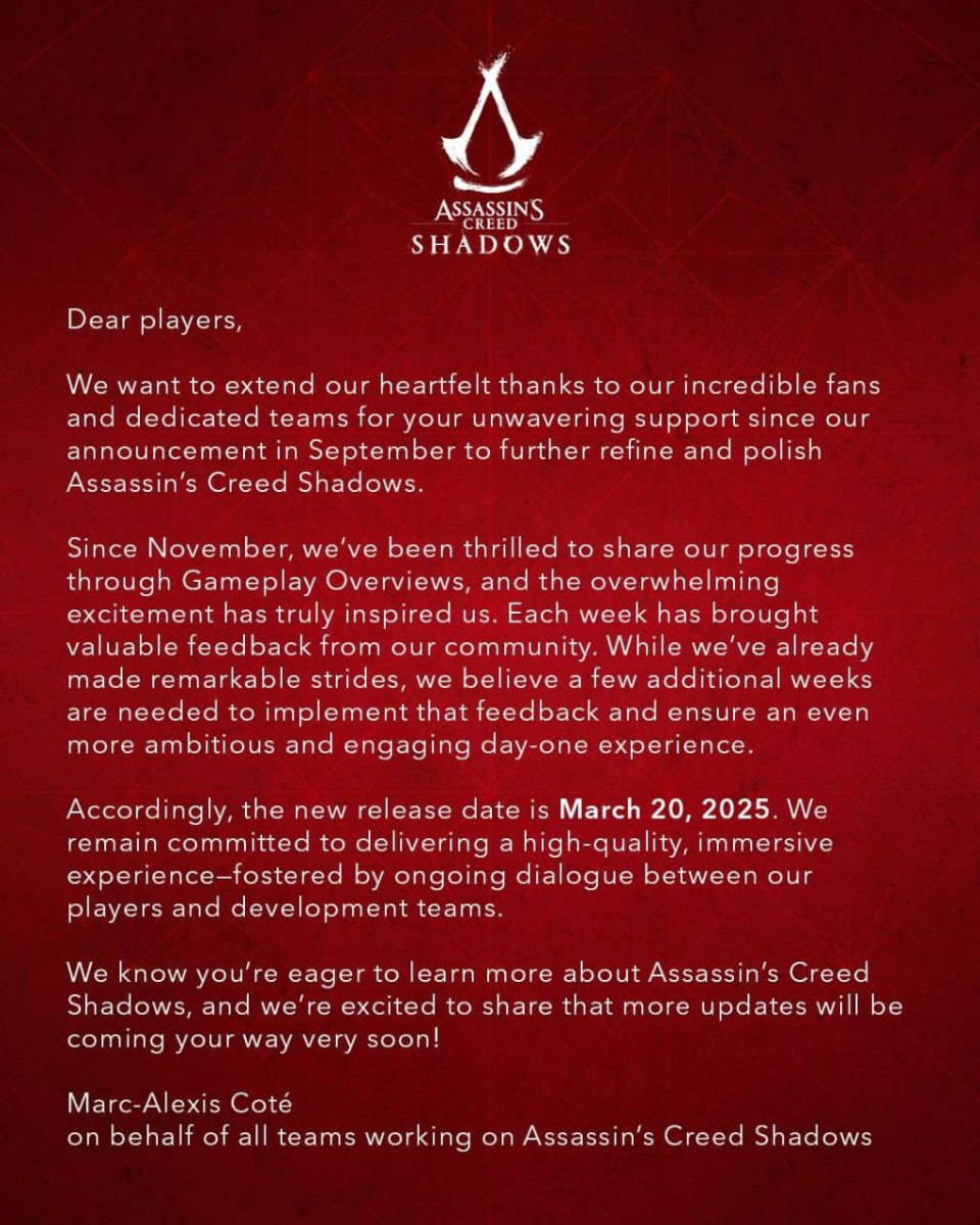 Компания Ubisoft объявила о переносе релиза игры Assassin’s Creed Shadows. Теперь запуск проекта запланирован на 20 марта 2025 года, что стало вторым переносом даты выхода. Ранее релиз игры был намечен на февраль, а изначально проект должны были выпустить ещё в ноябре прошлого года. Как сообщается в официальном заявлении от разработчиков, причиной очередного переноса стало желание обеспечить игрокам качественный и проработанный продукт. Очевидно, что одной из причин отсрочки стал высокий уровень конкуренции на февральском рынке видеоигр, из-за чего Ubisoft решила не торопиться и довести проект до более лучшего состояния. Ubisoft делает ставку на Shadows как на одну из ключевых частей серии, которая должна спасти позиции компании на рынке. Поскольку на игру возлагаются большие надежды в связи с туманным будущим Ubisoft. Разработчики пообещали делиться новыми подробностями о проекте в ближайшее время. Ожидается, что нас ждут дополнительные трейлеры, геймплейные ролики и анонсы особенност