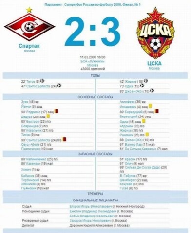 Футбольный сезон-2006 в России начинался 11 марта матчем за Суперкубок, если вынести "за скобки" игры в Еврокубках и Кубке России, которые состоялись несколько раньше. В преддверии матча в районе Рижского вокзала произошла "дружеская" встреча фанатов этих столичных клубов. "Спартак" не смог заявить на игру боевой состав.Из-за травм не смогли сыграть с армейцами основной вратарь Ковалевски, защитники Йиранек и Ковач. Наставник красно-белых А.Старков решил, что лучшая оборона -это нападение и выставил на игру состав, явно ориентированный на атаку. Обратило внимание, присутствие в составе голландца Квинси Овусу-Абейе. У "ЦСКА" же на поле был состав, самый что боевой, а последить особо интересно было за юным бразильцем Жо. В первые минуты с преимуществом играет "ЦСКА". Карвальо довольно опасно навесил со штрафного, а потом довольно остро подавал с угловых на Жо. На 9" дальний удар нанёс Д.Бояринцев-мяч прошёл мимо створ. Быстров соверши кросс, обыграл двоих, подал но голову Павлюченко.