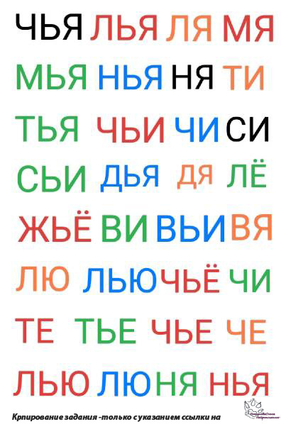 Продолжим говорить о "Мягком знаке". Что же делать дома, если ребенок пропускает на письме "Ь"? Читаем и слЫшим разницу, слУшаем паузу в слове перед гласными Е-Ё-Ю-Я-И: БЕ - БЬЕ, кораБЕльный - выБЬЕм БЁ - БЬЁ, жереБЁнок - поБЬЁт БЮ - БЬЮ, деБЮт - поБЬЮт БЯ - БЬЯ, БЯка - зуБЬЯ БИ - БЬИ, рыБИй - вороБЬИ ВЕ - ВЬЕ, кроВЕльный - короВЬЕ ВЁ - ВЬЁ, наВЕс - солоВЬЁм ВЮ - ВЬЮ, граВЮра - интерВЬЮ ВЯ - ВЬЯ, ВЯхирь - здороВЬЯ ВИ - ВЬИ, ВИтрина - солоВЬИ ДЕ - ДЬЕ, бёДЕр - тиховоДЬЕ ДЮ - ДЬЮ, ДЮгонь - клаДЬЮ ДЯ - ДЬЯ, вожДЯ - лаДЬЯ ДИ - ДЬИ, раДИо - олаДЬИ ЖЁ - ЖЬЁ - стаЖЁр - руЖЬЁ "Ё" пишется в словах с суффиксом "ЁР". ЛЁ - ЛЬЁ, ЛЁд - ЛЬЁт, поЛЬЁт ЛЮ - ЛЬЮ, Северный поЛЮс - поЛЬЮ ЛЯ - ЛЬЯ, УЛЯ - УЛЬЯна ЛЯ - ЛЬЯ, пуЛЯ - кеЛЬЯ ЛИ - ЛЬИ, иЛИстый - ИЛЬИн НЮ - НЬЮ, коНЮшНЯ - осеНЬЮ НЯ - НЬЯ, тюлеНЯ - тюлеНЬЯ НИ - НЬИ, коНИ - бараНЬИ, растеНИе - растеНЬИце ПЕ - ПЬЕ, ПЕнь - ПЬЕса ПЁ - ПЬЁ, ПЁстрый - ПЬЁт ПЮ - ПЬЮ, ПЮре - выПЬЮ ПЯ - ПЬЯ, тороПЯщий - хлоПЬЯ РЕ - РЬЕ, РЕпа - ЮРЬЕвич РЁ - РЬЁ, РЁбры