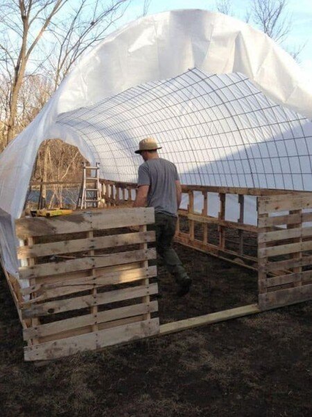 Мне неоднократно доводилось встречать в интернете теплицы, похожие на ту, что на фотографии. Она состоит из паллет и деревянных блоков внизу, каркаса из строительной сетки и плёнки или агроткани сверху. Получается дёшево и сердито.