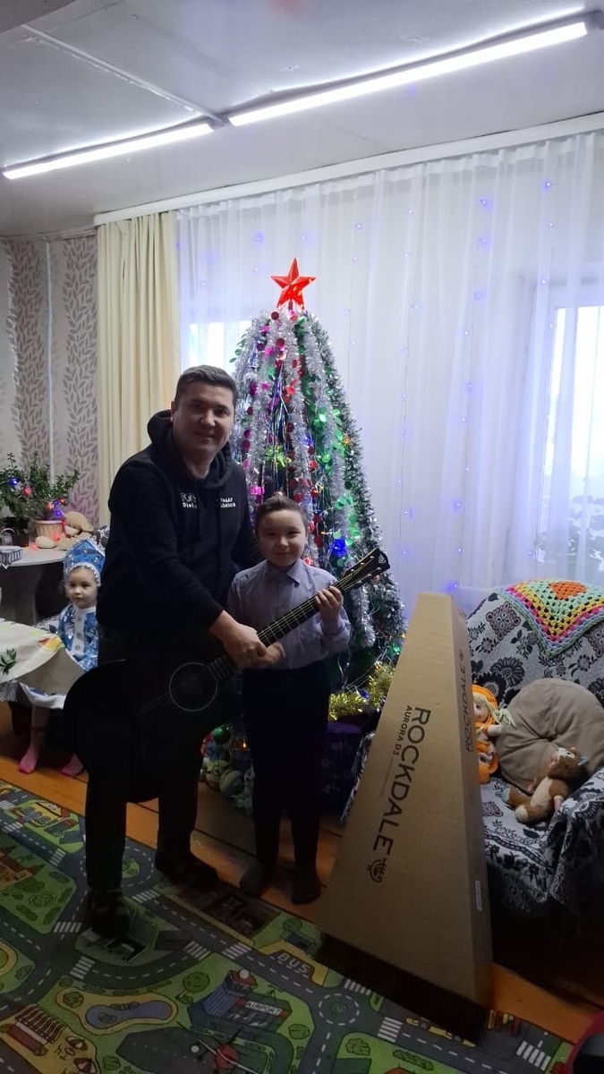 В семье Вахитовых четверо маленьких детей. Юный Батыр давно мечтал о музыкальном инструменте. Надеемся, он научится играть на гитаре и станет хорошим исполнителем. Спасибо уроженцу села Малояз Эльдару Газизову за его доброе сер