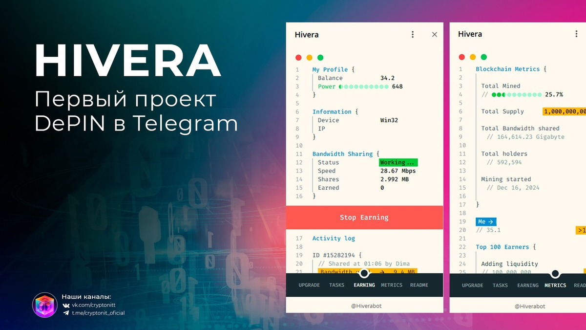 Проект зарабатывает на продаже трафика крупным сетям, которые тренируют ИИ на своих мощностях. Мы как пользователи предоставляем приложению трафик и получаем вознаграждение в виде будущих токенов. Такой подход называется DePIN - Decentralized physical infrastructure network (децентрализованная физическая инфраструктура). В приложении также есть и платные функции, однако, можно обойтись и бесплатным вариантом. Для добычи вам необходимо всего лишь запустить приложение в телеграм и наслаждаться добычей монет. Если же вы захотите вкладывать свои средства, будьте рассудительны и не поддавайтесь фомо. Пока что в целом по проекту мало информации. Начать фармить Hivera - vk.cc/cGifWN