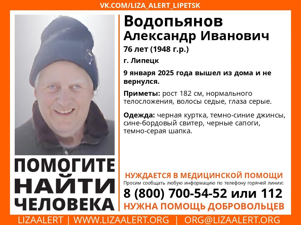 В Липецке начались поиски пропавшего 76-летнего Александра Ивановича Водопьянова. В минувший четверг, 9 января, пенсионер вышел из дома и не вернулся. Осложняются поиски тем, что пожилой липчанин нуждается в медицинской помощи. Об этом сообщили в региональном отделении поисково-спасательного отряда «Лиза Алерт». Приметы Александра Ивановича: рост 182 сантиметра, телосложение нормальное, седые волосы и серые глаза. В день исчезновения дедушка был одет в черную куртку, темно-синие джинсы, сине-бордовый свитер, черные сапоги и темно-серую шапку. Если вы видели пропавшего пенсионера или что-то знаете о его возможном местоположении, то сообщите об этом по телефонам — 112 или 8 (800) 700-54-52.