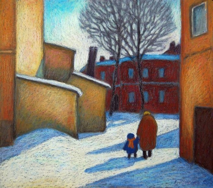 Ясный сияющий зимний день, полный чистых, понятных красок. И радоваться этому чудесному дню – удел старых да малых, всем остальным некогда, у всех остальных рутина. Идут эти двое неспешным шагом, беседуют между собой, и так им хорошо друг с другом. А взрослые, которых на картине нет, пусть о вас позаботятся.