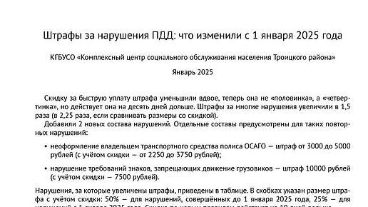 Скидку за быструю уплату штрафа уменьшили вдвое, теперь она не «половинка», а «четвертинка», но действует она на десять дней дольше. Штрафы за многие нарушения увеличили в 1,5 раза (в 2,25 раза, если сравнивать размеры со скидкой). Добавили 2 новых состава нарушений. Отдельные составы предусмотрены для таких повторных нарушений: Нарушения, за которые увеличены штрафы, приведены в таблице. В скобках указан размер штрафа с учётом скидки: 50% — для нарушений, совершённых до 1 января 2025 года, 25% — для нарушений с 1 января 2025 года. Скидка по новым правилам действует на 10 дней дольше. По остальным нарушениям базовый размер штрафа не изменили, но если сравнивать с учётом скидки, то его увеличили в 1,5 раза (например, штраф 800 рублей со скидкой 50% составлял 400 рублей, а теперь со скидкой 25% — 600 рублей). Читать на сайте