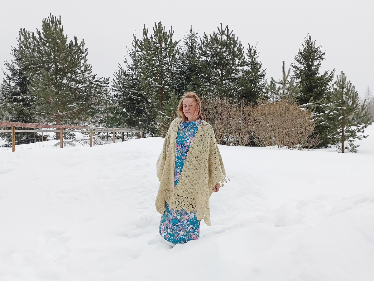 1) И первой вещицей, выпорхнувшей из моих рук по воле спиц и крючка стала Морозная шаль из овечьей шёрстки природного оттенка.
