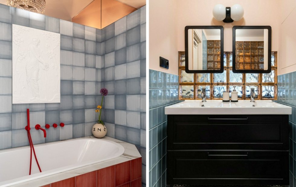 Дизайнеру Людмиле Данилевич удалось воплотить мечту хозяйки этой трехкомнатной квартиры — окно в ванной комнате. Его сделали из стеклоблоков, оформив ими кухонный фартук и стену в зоне ванны. Теперь в санузле есть естественный свет, и днем здесь даже можно не включать искусственное освещение. Для отделки остальных поверхностей выбрали микс краски и плитки. Светло-розовый оттенок стен хорошо рифмуется с глянцем голубой плитки. Динамики и контраста добавили с помощью геометричного керамогранита на полу. Красивое и функциональное решение — двойная раковина и два прямоугольных зеркала.