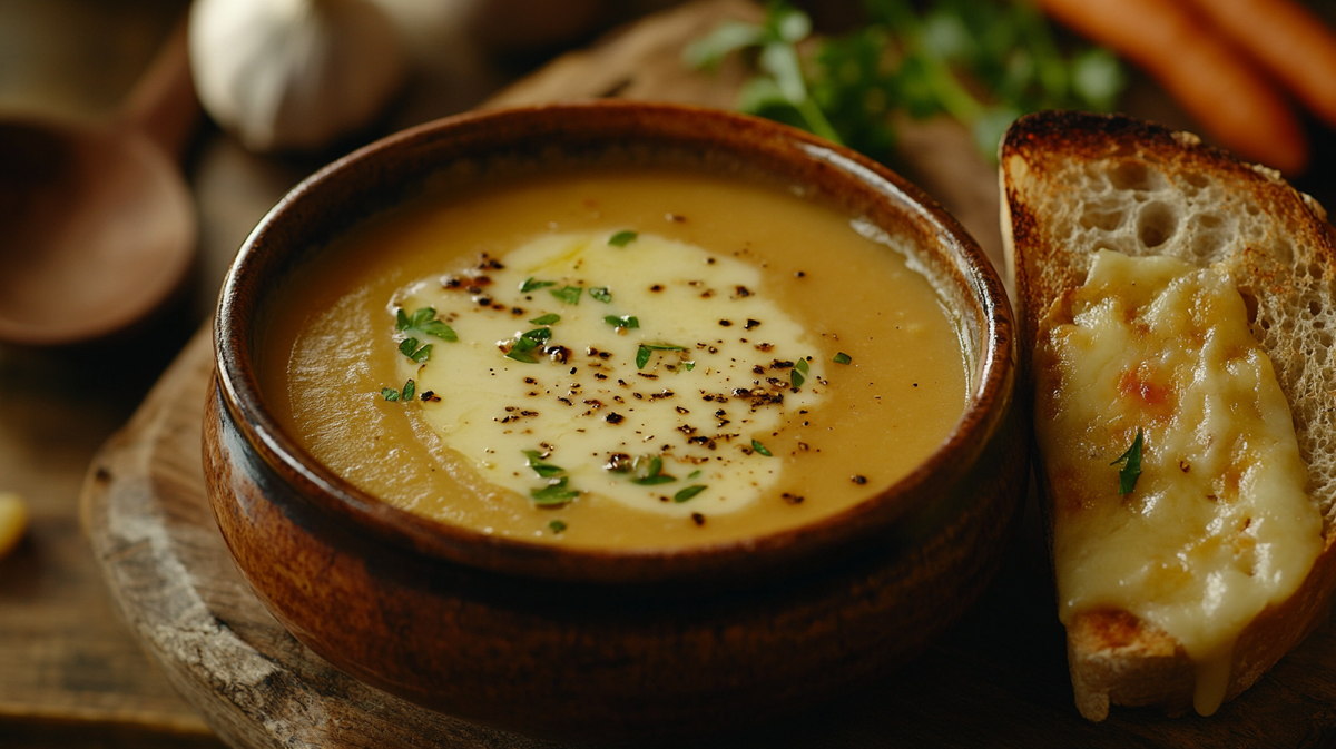 Отличная пара: поджаренный хлеб, острый сыр Это бретонское блюдо — один из знаменитых рецептов, описанных в книге «Необычный вкус» за авторством загадочного Гурмана. А вот популярность этого супа — совсем не загадка: обманчиво простой и невероятно нежный, он идеально сочетается с поджаренным хлебом и сыром. Опасность только в том, что вы можете заплакать от счастья... Ингредиенты: Приготовление: Совет: