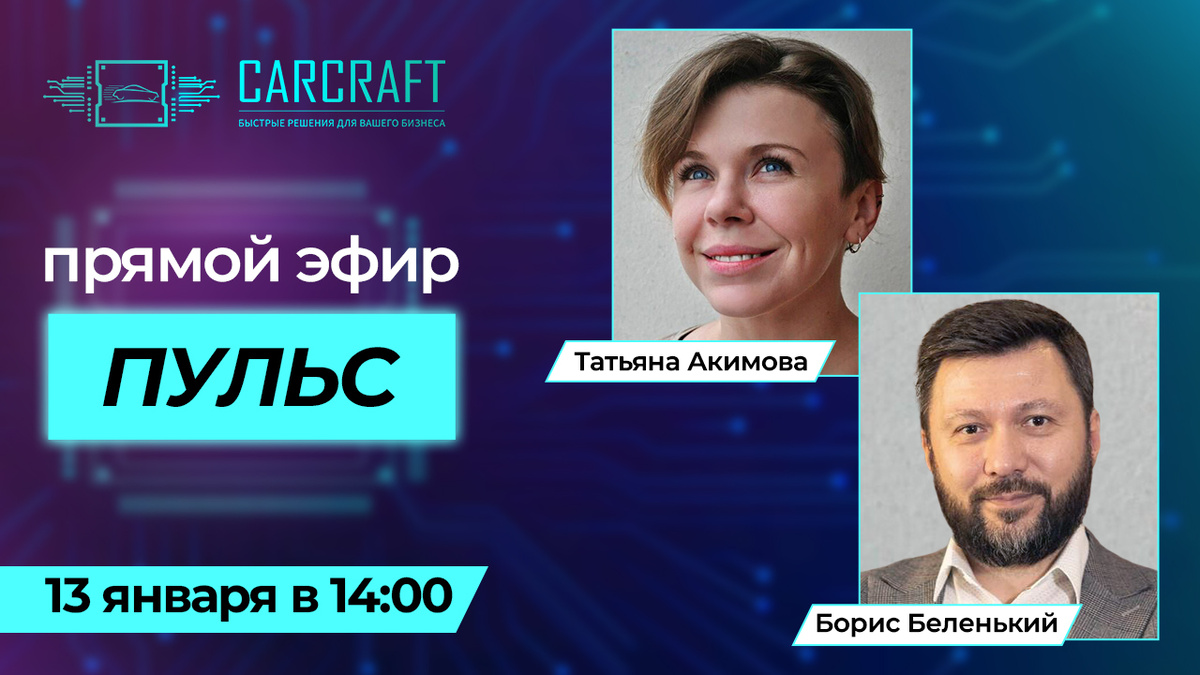13 января в онлайн-формате пройдет аналитический эфир «Пульс», организованный профессиональным сообществом «Автомаркетолог». Это ежемесячный формат, где эксперты автомобильного рынка обсуждают актуальные данные и тренды. Главной темой эфира станут возможности и вызовы, которые нас ждут в 2025 году, а также подведение итогов 2024. Соведущим эфира выступит Борис Беленький, CVO CARCRAFT GROUP, эксперт с многолетним опытом в автомобильной отрасли. Сотрудничество CARCRAFT с «Автомаркетологом» продолжается уже несколько лет, и каждое мероприятие укрепляет это партнёрство. Благодаря технологическим решениям и глубокому анализу данных, CARCRAFT вносит существенный вклад в развитие автомобильного бизнеса, предлагая участникам свежий взгляд на актуальные вызовы отрасли Программа эфира будет строиться на открытом диалоге двух эспертов Бориса Беленького и Татьяны Акимовой. Они представят различные статистические данные и множество аналитических фактов о состоянии и динамике автомобильного рынка. Н