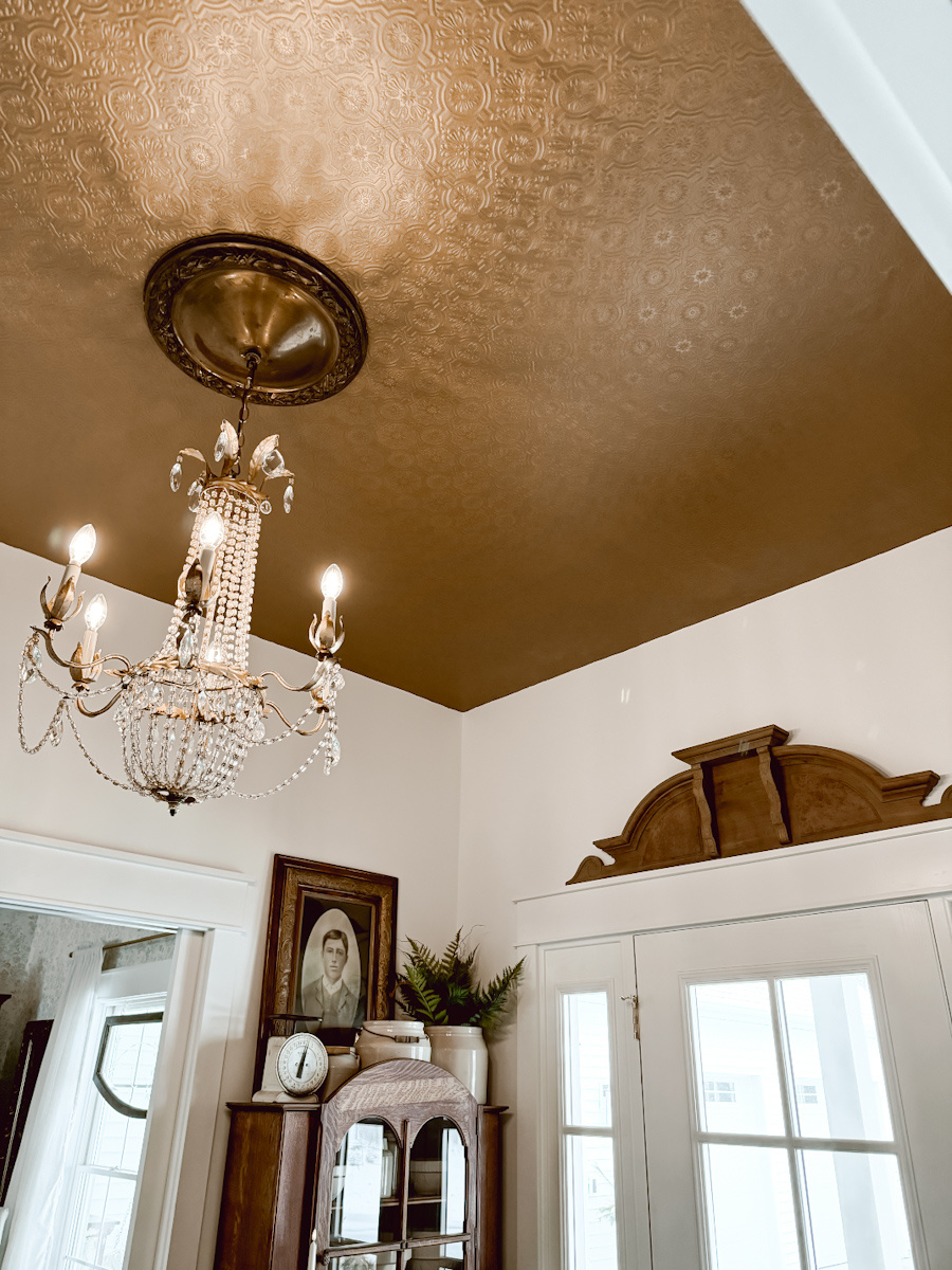 Несколько недель назад у нее появилась идея повесить их на потолок в прихожей, чтобы он выглядел как жестяной потолок и придавать ему необходимую текстуру.