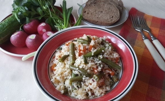 Ароматный рис со стручковой фасолью и другими овощами вкусен и в теплом, и в холодном виде. Можно подать как самостоятельное блюдо или на гарнир. Подойдет для постного стола.