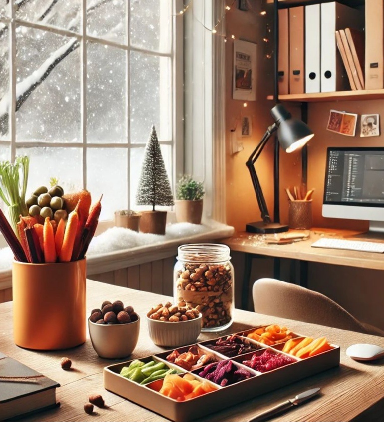 «Как один маленький шаг изменит ваши зимние офисные дни» Однажды мой коллега, сидя за рабочим столом с чашкой кофе, заменил привычный круассан на горсть орехов. Казалось бы, мелочь. Но через месяц он заметил, что чувствует себя бодрее, меньше устает и даже сбросил пару килограммов. Хочется узнать, что это за секрет? В конце статьи вы найдете несколько идей, которые сможете применить прямо завтра. Зима — это время, когда наш организм требует больше энергии, а соблазны вроде сладостей, выпечки и других «быстрых» перекусов становятся особенно притягательными. Но такие продукты несут лишь кратковременную радость, а потом оставляют нас уставшими и непродуктивными. Вот список полезных замен, который сохранит вашу продуктивность, поможет укрепить иммунитет и подарит зимним будням нотку свежести. Орехи (миндаль, кешью, грецкий орех) богаты полезными жирами и магнием, которые поддерживают работу мозга. Добавьте горсть кураги или инжира — и получите приятный сладкий вкус без лишнего