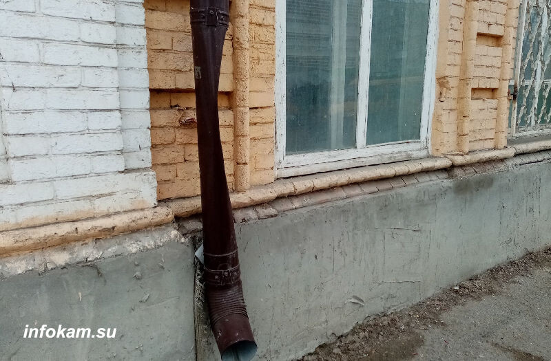 По этой системе и пришёлся очередной удар: в настоящее время все водосточные трубы со стороны улицы Пролетарской погнуты в завершающей части — ближе к тротуару. Местами погнуты и завершающие элементы — водосливы. Местные жители говорят, что это дело рук, а точнее ног подростков-вандалов, которые в тёмное время суток просто пинали трубы ногами. Как говорят, «чесалось у них».