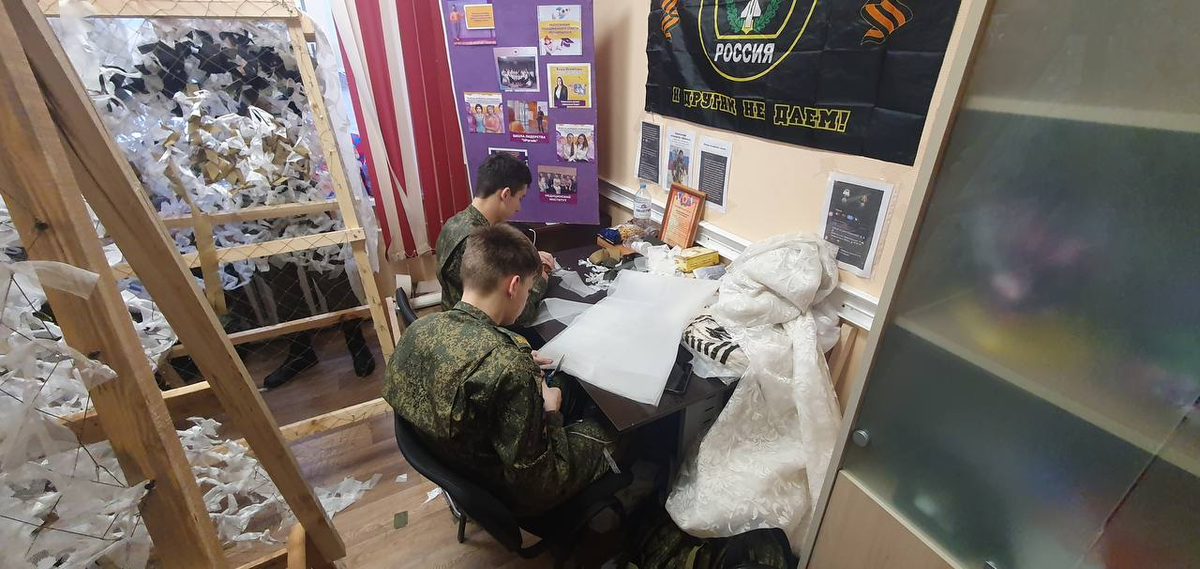 С начала учебного года к группе присоединились студенты, проходящие обучение в Военном учебном центре. На днях активистами была изготовлена маскировочная сеть в зимнем варианте.