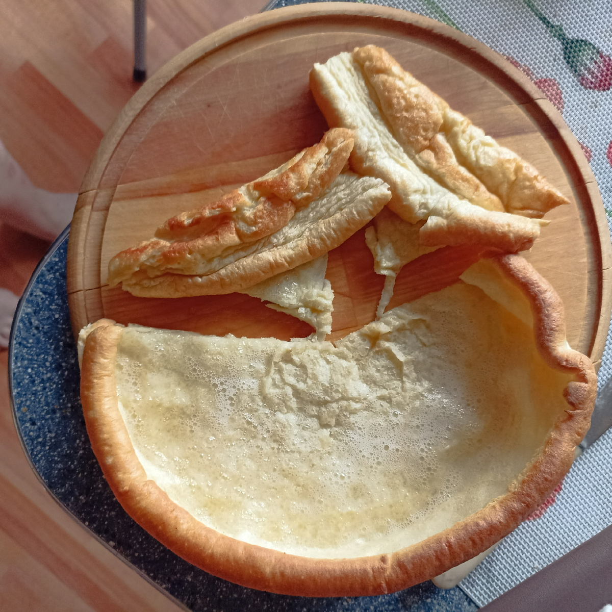 Рецепт: 30 мл (это столовая ложка или два булька из бутылки, тут плюс-минус не суть это для смазки)растительного масла без запаха заливаем в форму и ставим 190- 200 градусов греться. Тесто: 2 яйца, щепотка соли, чайная ложка сахара. Можно без него, но я люблю с ним. Мешаем венчиком, вливаем100 мл молока, это полстакана, мешаем, 100 грамм муки - неполный стакан, примерно 2\3. Домешиваем до однородности - тесто жидкое получается, как на блины. Вливаем в горячую форму, ставим в духовку и не открываем её! Иначе магии бортиков не случится. Минут через 10 можно снизить температуру до 150. Еще минут 10 максимум и достаем. Бортики и пузыри опадут, это нормально. Всё, можно есть. Как обычные блины с вареньем и сметаной, с творожным сыром и колбасой.