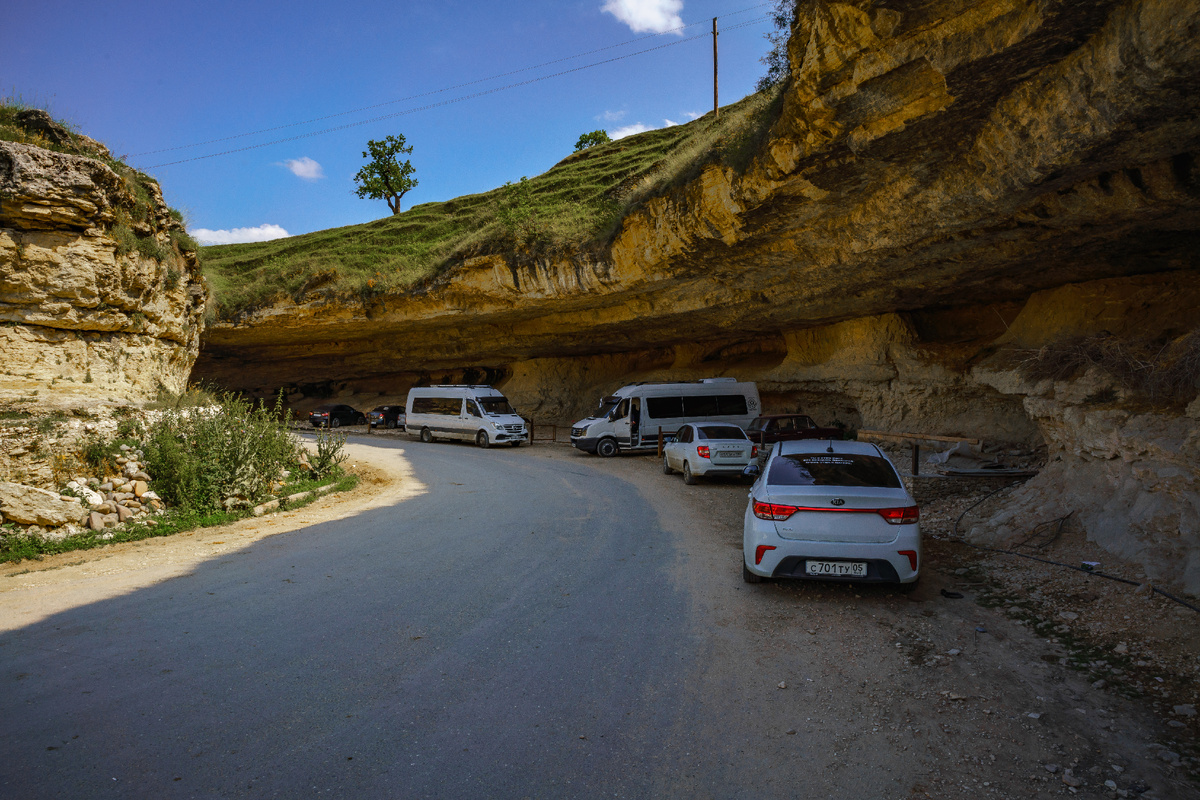 Выехал из Дербента рано утром. 165 километров до села Салта преодолел довольно быстро, часа за три. Главная достопримечательность этого места, Салтинское ущелье, которое тянется почти на полкилометра и находится в самом центре Республики Дагестан. Есть охраняемая стоянка, но если проехать чуть дальше, можно оставить машину бесплатно, под нависающими горными сводами. Отсюда с окраины села начинается маршрут в ущелье. Оно настолько узкое, что порой создаётся впечатление, будто идёте по тёмной пещере. Да ещё по колено в холодной горной воде реки Салтинка. Перед входом местные предприниматели выдают напрокат высокие сапоги, они будут не лишними в полноводье. Полноводность реки зависит от времени года. Настоятельно советую переобуться. Путь заканчивается в огромной горной полости, напоминающей гигантский подземный грот. Скалы здесь почти смыкаются над головой, образуя козырёк. Сверху через округлое скальное отверстие с грохотом низвергается огромный водный поток, образуя необыкновенно кра
