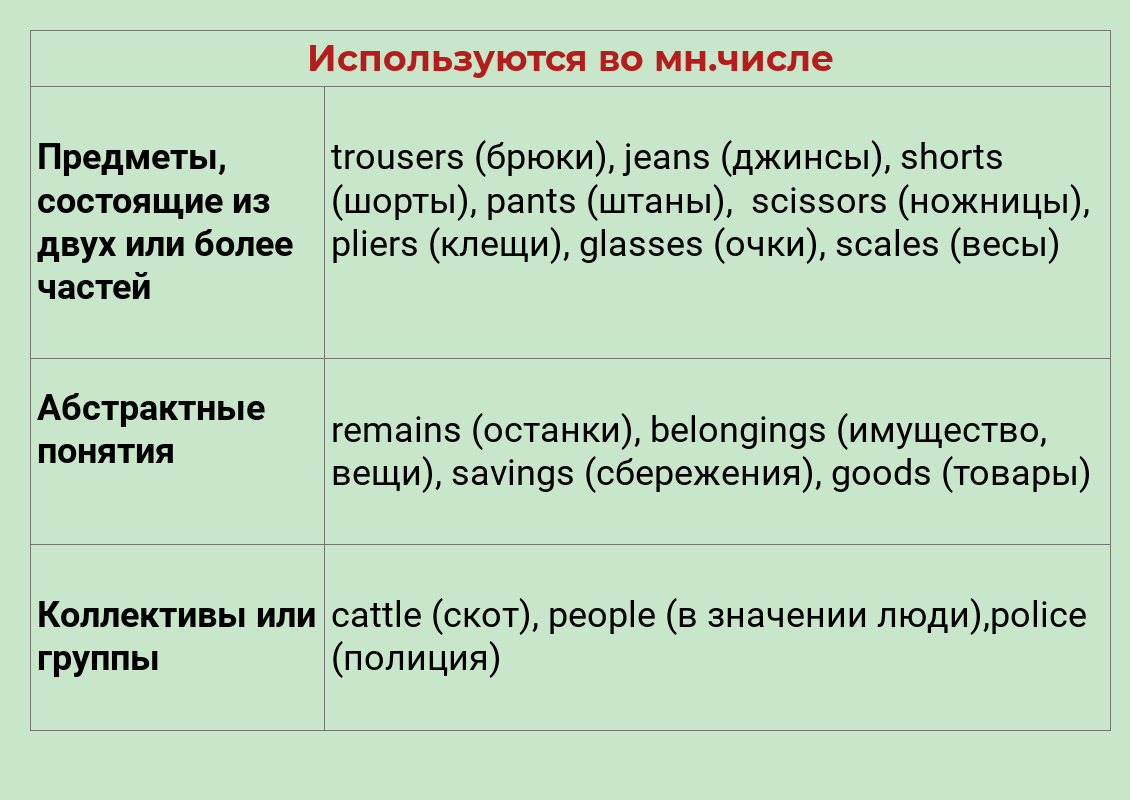 На сегодняшнем уроке мы рассмотрим подробнее такой аспект множественного числа, как существительные, которые всегда используются во множественном числе. Да-да, есть и такие, и на начальном этапе изучения языка некоторые из моих учеников тщетно пытаются прибавить к ним еще одну –S, чтобы образовать множественное число, а некоторые, наоборот, уверены в том, что, убрав окончание, они получат слово в единственном числе. Но это далеко не так. Поэтому предлагаю вам раз и навсегда выучить существительные, которые могут быть использованы только во мн.числе.
