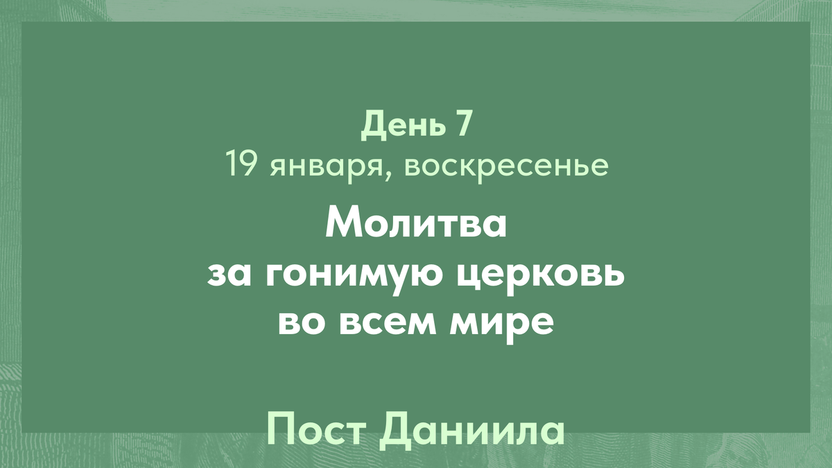 «Итак, не стыдись свидетельства Господа нашего Иисуса Христа, ни меня, узника Его; но страдай с благовестием Христовым силою Бога».(2 Тим. 1:8) Не следует стыдиться дела благовестия о Христе. Надо быть готовым даже пострадать за него, рассчитывая на силу Божью. Молитва за гонимую церковь во всем мире · о силе и мужестве для христиан, которые переносят гонения, о мире в их сердцах, чтобы их вера не оскудела · о росте, укреплении и Божьей защите церквей в странах, где преследуют христиан · чтобы Дух Святой помог преследуемым христианам простить своих гонителей (Мф. 5:44) · чтобы христиане во всем мире осознавали необходимость молитвенной поддержки церквей, которые переживают трудности Больше информации о гонимой церкви — на сайте фонда «Варнава»: baeurasia.org Молитва о пасторах, служителях и всех верующих церквей региональных объединений Псковское объединение (Ю. Н. Никифоров) Новгородское объединение (С. Б. Побединский) Калининградское объединение (В. Я. Игнатенко) Объединение церквей