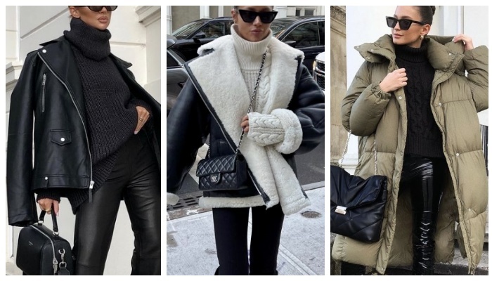 Эксперты моды поделятся с нами секретами создания стильных образов для холодной погоды, которые не дадут замёрзнуть. Специалисты предлагают начать с брючного костюма из плотного кашемира — он станет основой эффектного аутфита. К нему следует добавить вязаную белоснежную шапку, которая гармонично дополнит наряд. Пальто карамельного оттенка согреет в непогоду и придаст образу изысканность. Чтобы добавить современности и комфорта, можно завершить образ белыми массивными кроссовками и надеть вязаные перчатки. В данном случае стёганый пуховик цвета хаки, дополнен чёрным вязаным свитером, который подчёркивает строгость образа. Кожаные брюки внесли элемент элегантности и практичности, а массивные ботинки на тракторной подошве добавили удобства и уверенности в каждом шаге. Финальным штрихом стала объёмная дутая сумка — стильный и функциональный аксессуар. Зимние дубленки-авиатор в холодное время года уместно будет комбинировать с базовыми джинсами, объёмными свитерами, а также трендовыми ботил