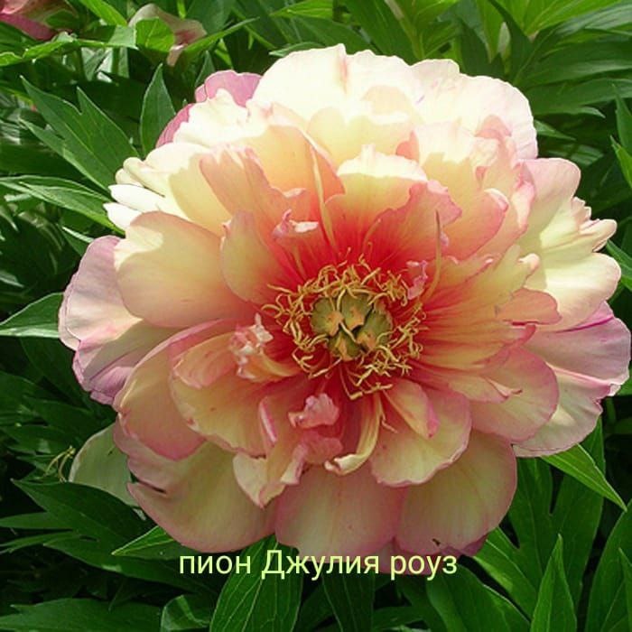 Пион Джулия Роуз — это восхитительный гибрид с полумахровыми цветками, который станет настоящим украшением вашего сада. Куст достигает высоты 90 см, а его цветки выделяются крупными размерами и нежными оттенками абрикосового, розового и жёлтого цветов с яркими красными штрихами на лепестках. В одно и то же время на кусте можно увидеть три разных оттенка, что создаёт ощущение гармонии и красоты. Аромат этого пиона лёгкий и приятный. Цветение пиона Джулия Роуз приходится на средние сроки. При посадке важно следить за тем, чтобы почки находились на расстоянии 3–5 см от уровня земли. Если посадить пион слишком глубоко или слишком высоко, он может не зацвести. Полностью сортовые качества пиона Джулия Роуз раскрываются через 2–3 года после пересадки.