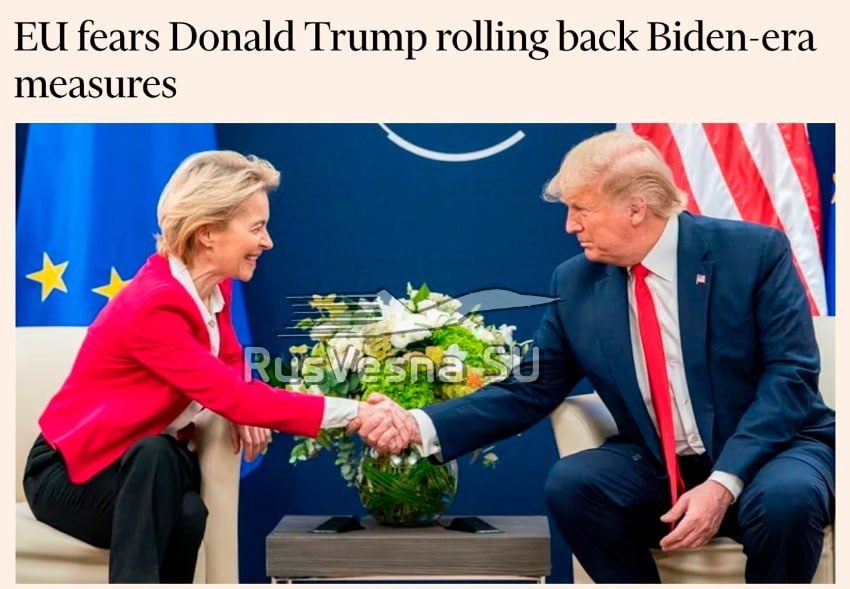 ▪️Чиновники ЕС надеются, что Трамп сохранит их, чтобы использовать в качестве рычага на переговорах. ▪️Сейчас европейцы в спешке перечитывают все указы Байдена, чтобы понять, какой ущерб может нанести Трамп, если решит отменить все их не глядя, просто потому что их выдавал Байден. ▪️Председатель Европейской комиссии Урсула Фон дер Ляйен также обеспокоена тем, что новый президент может кардинально изменить политику по отношению к Европе. Сейчас она пытается добиться встречи с Трампом до инаугурации, чтобы обсудить возможность продолжить конфликт на Украине и разубедить президента ввести пошлины на торговлю с Киевским режимом.