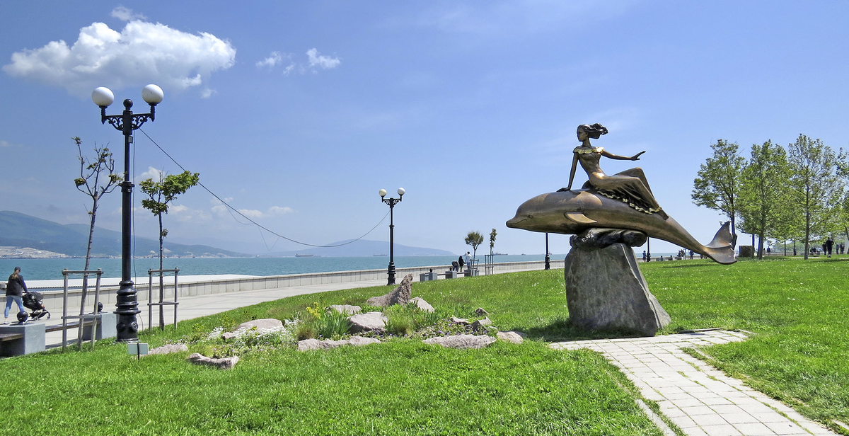 С главной в Новороссийске Форумной площади, где стоит крейсер-музей "Кутузов", на юг провожают романтичные "Дельфин и Русалка" (2007). В них нет особого подтекста - многие скульптуры на берегу Цемесской бухты стоят просто для красоты: