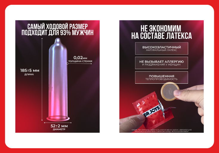 Презервативы DR.JOYS имеют толщину 0,02 мм. Для сравнения: многие бренды называют «ультратонкими» презервативы толщиной 0,055 мм. Как нам удалось добиться такой тонкости? Благодаря партнёру-производителю с 10-летним опытом и швейцарской системе контроля качества.