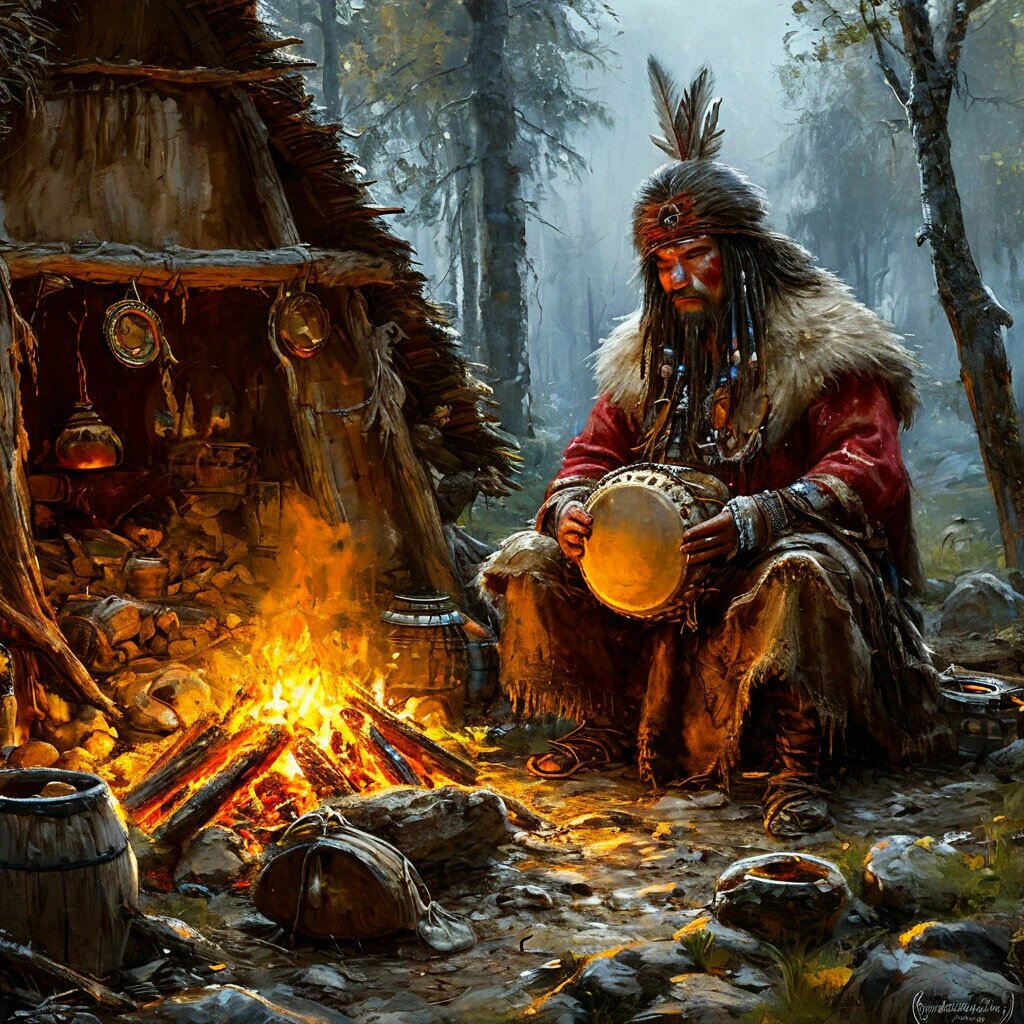 Шаман стал ходить вокруг костра, издавая нечленораздельные звуки, он бил в бубен и призывал духов. Несколько раз он подходил к костру и подбрасывал туда травы и подливал масло. Внутреннее помещение быстро наполнилось коптящими запахами, которые дурманили и вызывали сонливость.