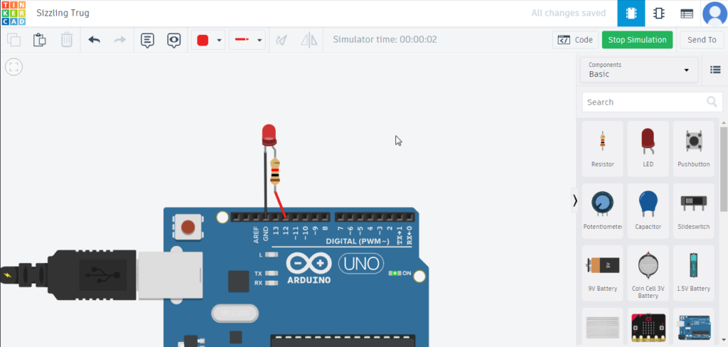 Нажимаем зелёную кнопку Stop simulation (Остановить симуляцию), перетаскиваем резистор из колонки компонентов. Удаляем предыдущий красный провод, перетаскиваем резистор к контакту светодиода и он сам «примагнитится» как нужно. Теперь нажимаем на свободный контакт резистора, затем на 12-й пин Arduino, соединяем таким образом схему.
