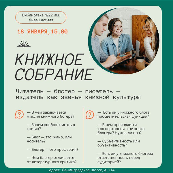 Первая встреча - 18 января в 15.00 по адресу: Ленинградское шоссе, д.114, библиотека № 22 им. Кассиля.
