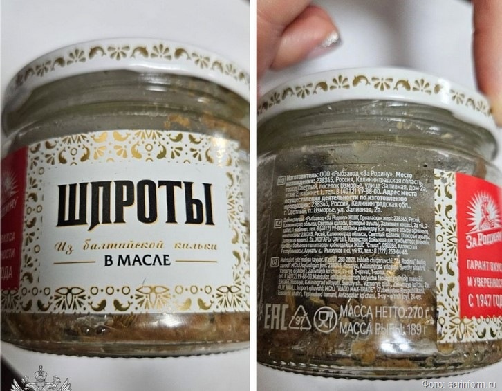 Калининградский производитель шпрот подтвердил качество продукции в ходе проверки Роспотребнадзора — в шпротах завода «За Родину» не были обнаружены бактерии Clostridium botulinum. Консервы безопасны, отвечают всем стандартам качества и техническим регламентам, включая ГОСТ 280-2021, сообщили в ведомстве. Представитель завода отметил, что бактерии Clostridium botulinum не могут быть в шпротах из-за их обработки при температуре 120 °C и стерилизации в течение 30 минут. Две недели назад шпроты завода «За Родину» начали изымать из торговых сетей в Саратовской области. Партия шпрот изготовлена 13 сентября 2024 года и продавалась в стеклянных банках весом 270 граммов. В управлении Роспотребнадзора по Саратовской области заявили, они могут вызвать ботулизм.