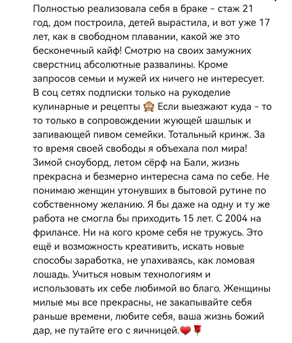 Еще я разместила эти скрины комментариев для тех женщин, которые до сих пор страдают от того, что они не замужем, или которые давно хотят развестись, но боятся. Посмотрите – есть женщины, которые счастливы и живут свою интересную жизнь без брака! И таких женщин много! Поверьте, что это реально!