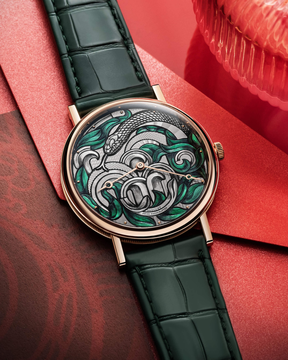 Первая новинка 2025 года ожидаемо посвящена его покровительнице – зеленой деревянной змее. Мудрая рептилия изображена на часах среди пышной листвы. В создании композиции использовали сочетание гравировки, гильоширования и росписи. В тон ультратонкому корпусу из розового золота стрелки и едва заметные часовые метки из розового золота изготовлены из того же металла. Подробнее о часах читайте в обзоре.