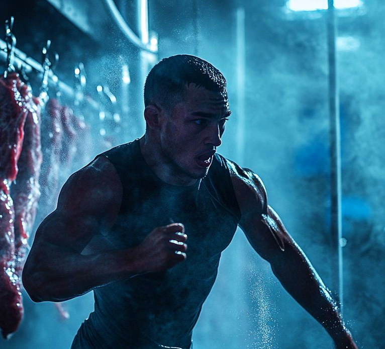 Температура минус восемнадцать градусов, вокруг туши замороженного мяса, а посреди всего этого — парень в шортах и футболке выполняет отжимания.