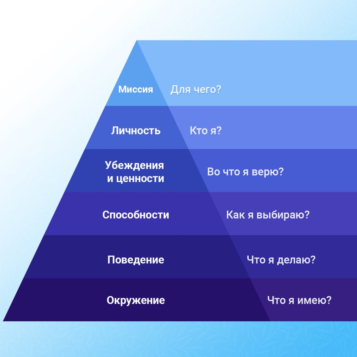 Пирамида Роберта Дилтса — это модель, которая в восходящем порядке показывает уровни, влияющие друг на друга. Пользуясь этой моделью, можно понять, на каком уровне проблема возникла и на каком уровне ее нужно решать.