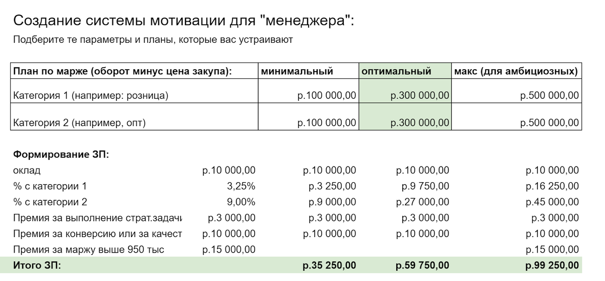 Выше приведена таблица для определения заработной платы для сотрудника. Эта таблица есть в виде шаблона в бонусах к книге. По каждому сотруднику вы можете поставить план и просчитать результат. Свои планы есть у HR-менеджера, директора по маркетингу, менеджера по продажам и у остальных должностей. Например, если мы говорим о HR-менеджере, то это выполнение плана по вводу нужного количества людей в месяц. В приведенном примере рассматривается торговая компания, в которой две категории продаж: розница и опт. И три плана продаж, которые менеджер может выполнять, — минимальный, оптимальный и максимальный. Каждый собственник в своем бизнесе понимает, какой объем продаж (по марже!) на одного менеджера является нормальным. Этот объем и ставим в колонку «оптимальный план». То есть, если человек делает маржу 600 тыс. рублей, это нормально. А если 1 млн. рублей, то он совсем молодец. В нашем примере руководитель готов заплатить 59 тыс. рублей за выполнение плана 600 тыс. рублей маржи. А если буд