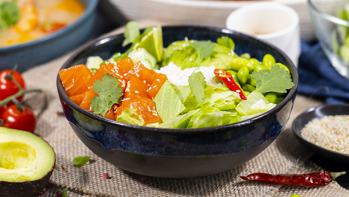 • Соль – по вкусу 1. Огурцы нарежьте средним кубиком, авокадо — полукольцами. Салат крупно нарубите. Рыбу очистите от кожи и нарежьте крупным кубиком. Рис заранее отварите и остудите. 2. Для заправки смешайте мед, соевый соус, кунжутное масло и сок четверти лайма. 3. На дно глубокой тарелки влейте немного заправки. Затем выложите рис, сверху – огурец, авокадо, бобы эдамаме, салат и форель. 4. Украсьте поке нарезанным перцем чили, кинзой, долькой лайма и посыпьте кун