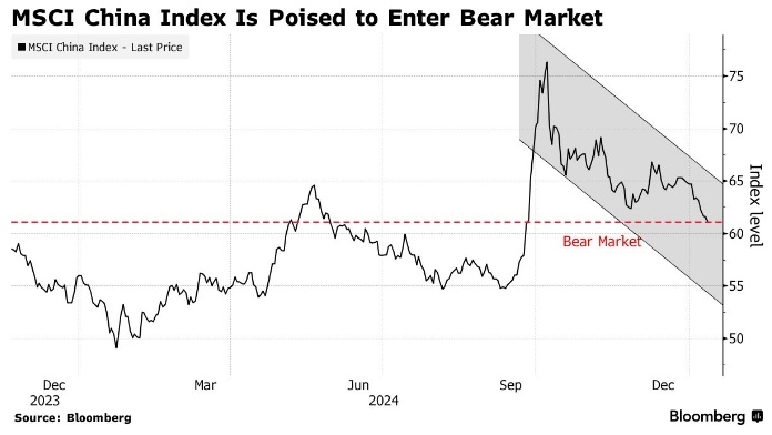 Индекс MSCI China продолжает падение с 7 октября, которое приближается к 20%. Инвесторы готовятся к обострению геополитической напряженности В пятницу акции китайских компаний упали, что привело к снижению индекса MSCI China на 1,1%. Это стало очередным ударом по рынку, который и без того переживает не лучшие времена. Геополитическая напряжённость продолжает нарастать, особенно в преддверии инаугурации нового президента США Дональда Трампа. Это вызывает опасения инвесторов и усиливает неопределённость на рынке. Индекс CSI 300, который отслеживает динамику акций 300 крупнейших компаний Китая, торгующихся на бирже в Шанхае, также снизился на 0,9%. Это уже второй раз за неделю, когда индекс теряет более 1%. Начало 2025 года не задалось для инвесторов. Они готовятся к новым ограничениям на экспорт чипов искусственного интеллекта, которые могут привести к дальнейшему экономическому спаду в Китае. На этой неделе США внесли в свой чёрный список две китайские компании — Tencent Holdings Ltd. и