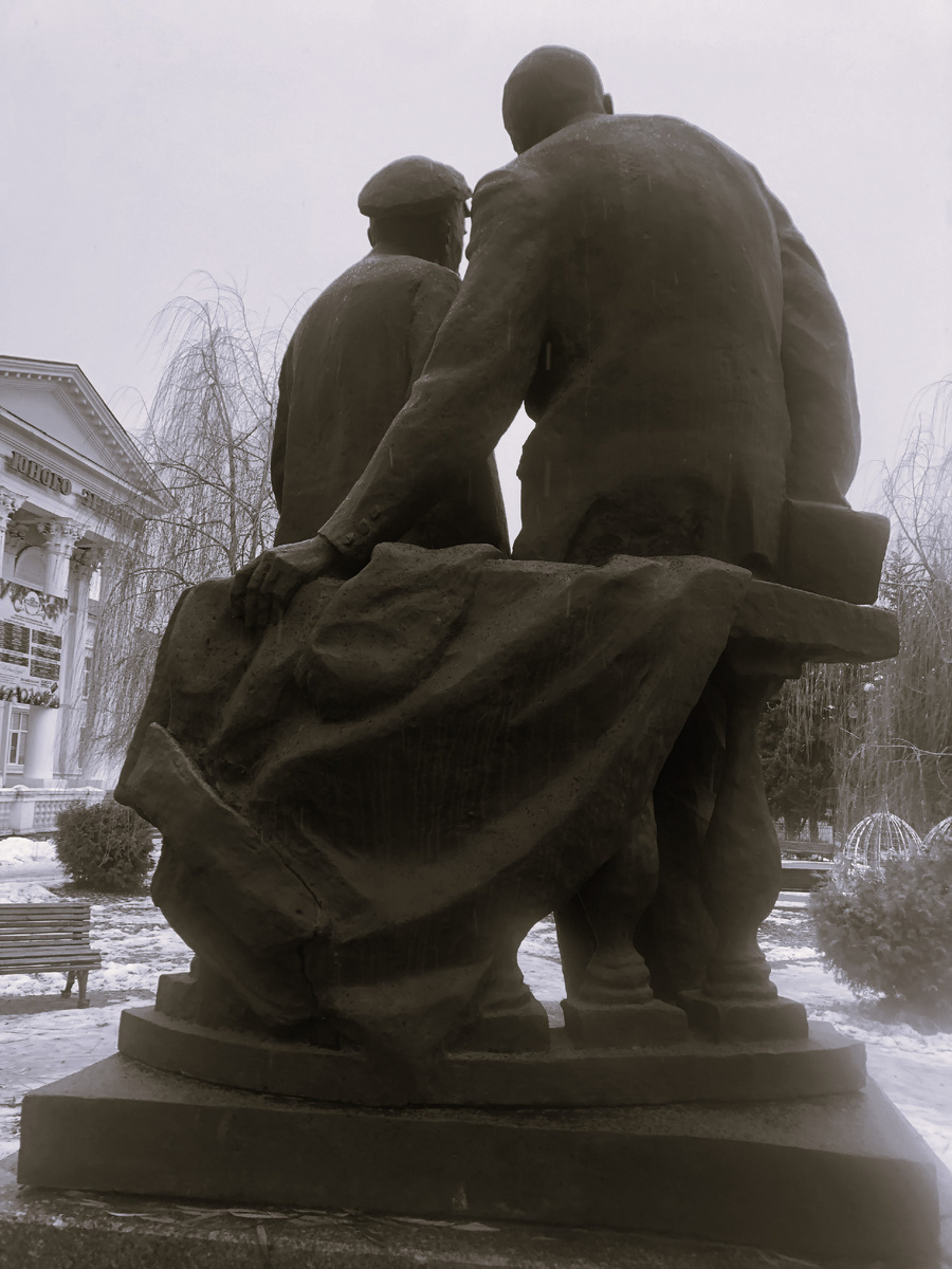 - А давай я тебе памятник козлоногим покажу! - ??? А ведь действительно - с определённого ракурса кажется, что это не Горький и Ленин, а какие-то колченогие сатиры :)... Если обойти, то, конечно, становится понятно, что это Горький и Ленин, которые то ссорились, то дружили по своим там творческим и политическим соображениям. И которые ни разу не были в Брянске (однако тут пересекаются проспект Ленина и улица Горького, почему бы и не поставить?). С этой стороны они даже кажутся почти одного роста, хотя Горький был высоким, а Ленин - маленьким. Мне понравился отзыв с autotravel.ru, писал Ckrosh: "Памятник понравился, очень уж мощная композиция и набор деталей. Кстати отдельно Горький (такой же, но без Ильича) стоит чуть дальше по улице, у школы № 4. В принципе отмечаю, что групповые памятники с Лениным (из тех, что я видел), как правило, получаются очень удачно, в отличие от стандартных одиночных с протянутой рукой". Согласна! У вообще люблю фотографировать Ленина в разных видах, и вот