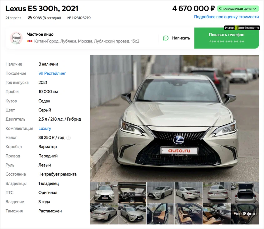 В этот раз изучаем объявление о продаже Lexus ES 2021 года выпуска. Седан предлагают в Москве за 4,67 миллиона рублей. В ЭПТС — один владелец.
