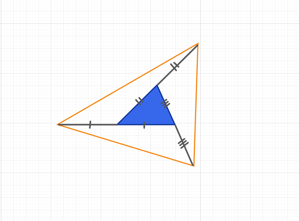25.★☆☆ Площадь голубого треугольника равна 1. Его стороны продолжили так, как показано на рис. и получили точки A, B и C. Найдите площадь треугольника ABC.