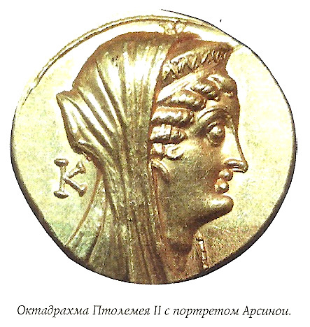 На которых изображена его обожествленная сестра и жена Арсиноя II. Арсиноя умерла в 270 году до н.э., и ее портреты стали украшением редчайших золотых двойных октадрахм (вес 55,55 г), а также октадрахм (27,8 г) и пентадрахм (17,8 г). Внимания заслуживают и золотые октадрахмы его сына Птолемея III Эвергета с парными портретами своих родителей — Птолемея II и Арсинои II, а также Птолемея I и Береники I, основателей династии.