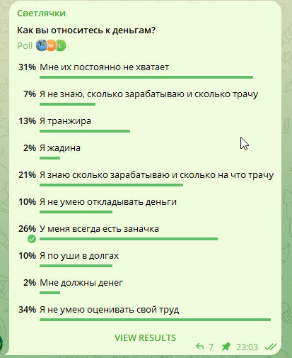 По результатам опроса больше всего процентов набрано за последний пункт "Я не умею оценивать свой труд". Именно этот пункт я распишу в этой статье. А те, кто хочет исправить ситуацию со своими финансами - следите за анонсами на моем канале телеграм Итак, что стоит за тем, что вы не умеете оценивать свой труд? Во-первых - это финансовая недооцененность, т.е. вы заведомо называете цену ниже, чем на самом деле стоите, а если называете адекватную сумму, то начинаете оправдываться и чувствовать себя некомфортно. Во-вторых - это проблема с самооценкой и неуверенность в своих компетенциях - т.е. синдром Самозванца. В-третьих - это состояние убогости, которому предшествует состояние гордыни. Эдакие качели "Я - звезда, я - никто".