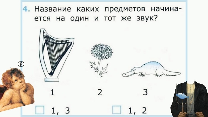 Попробуем разобраться в этом непростом задании. Бонусом решим мини-тест с разбором нескольких похожих упражнений. Уже не один год родители первоклассников гадают, как решить это задание. В интернете встречала множество споров. Какой ответ выбрали бы вы: 1, 3 или 1, 2? На первой картинке арфа, на второй - одуванчик, на третьей - утконос. И вот здесь первое недоумение. Все эти слова начинаются на разные звуки. Или все же не на разные? Споры начинаются уже с первой картинки. Не все первоклассники знают, что это арфа. С утконосом проблем особых нет. А что за цветок на второй картинке? Многие уверяют, что это астра. Тогда что тут сложного? Выбираем вариант арфа, астра. Начинаются на А. Только разве у астры бывают такие листья? Нет, здесь точно одуванчик. Какой тогда вариант ответа выбирать? Тут все в ступоре. И только те, кто в школе внимательно слушали темы, связанные с фонетикой, прекрасно понимают правильный ответ. Дело в том, что одуванчик мы произносим как [адуван'ч'ик]. Задание